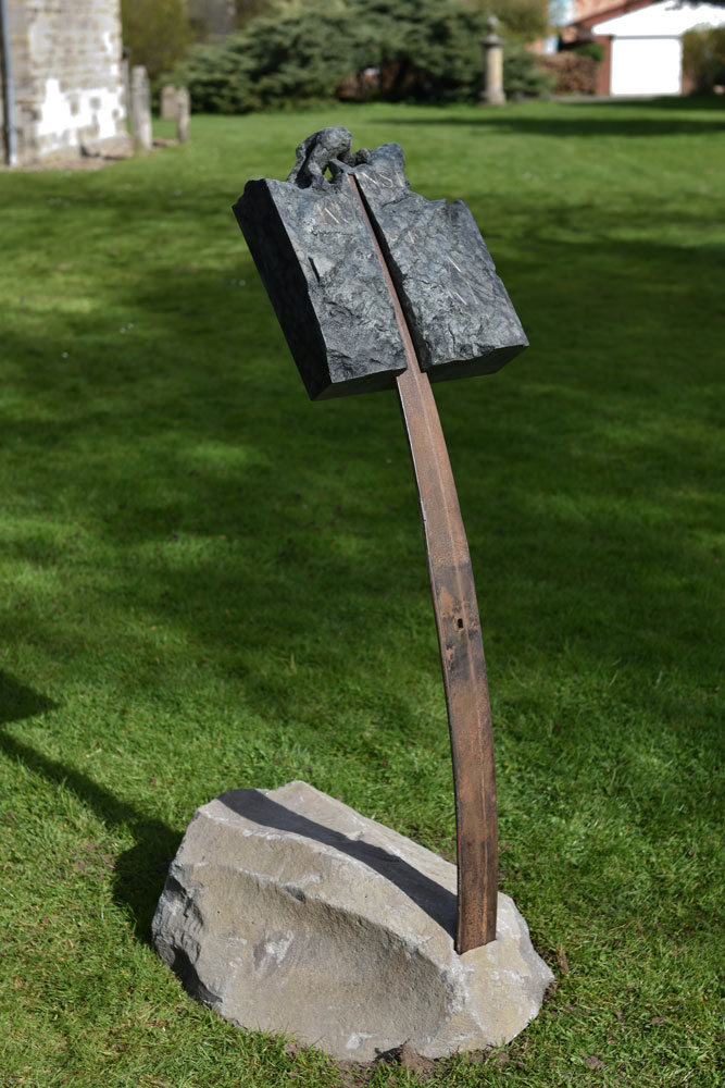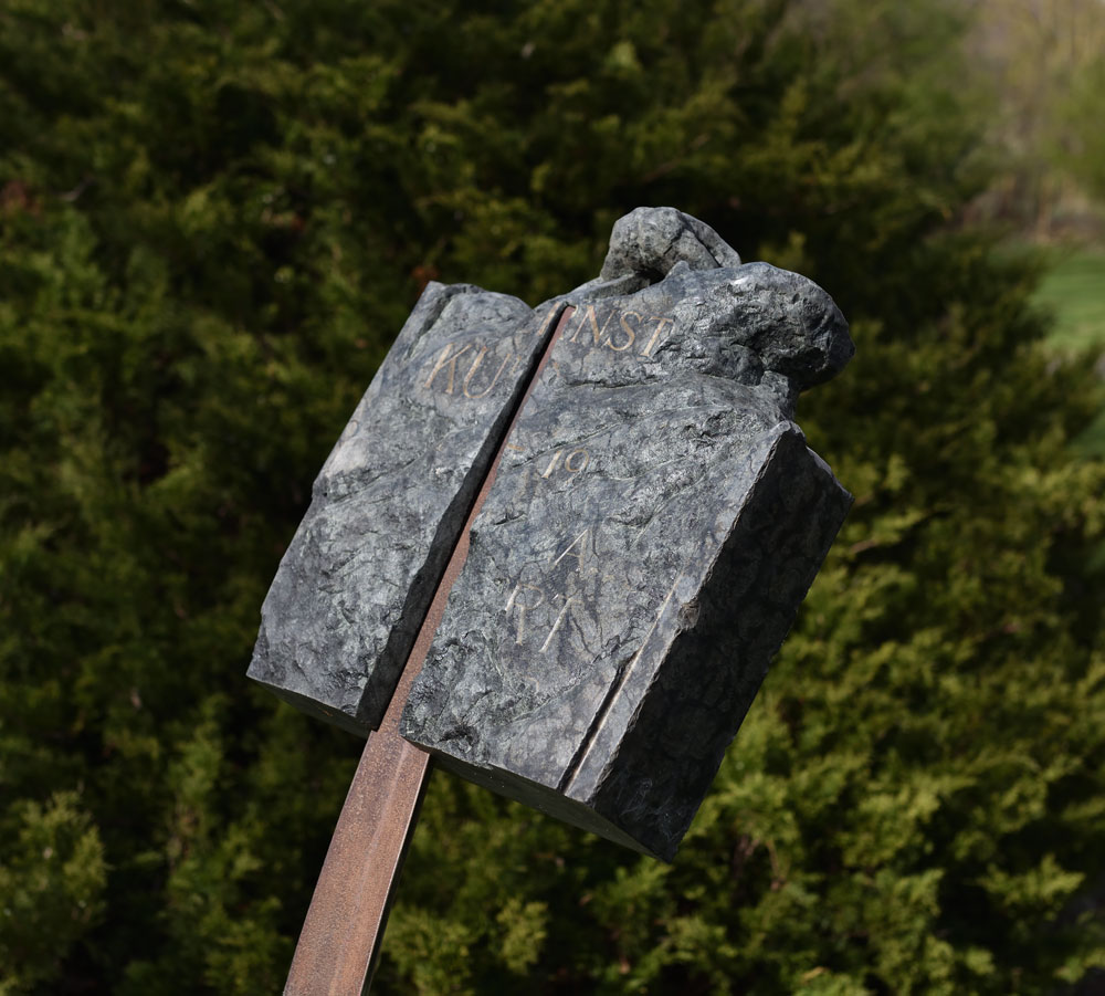 Eine besondere Dynamik erhält die Skulptur durch ihre Basis: Der Stein ist auf eine alte Blattfeder gesteckt. Diese elastische Aufhängung lässt die schwere Masse des Diabas schwingen und macht die Instabilität des Augenblicks sowie die körperliche Anspannung des Aufstiegs physisch spürbar.