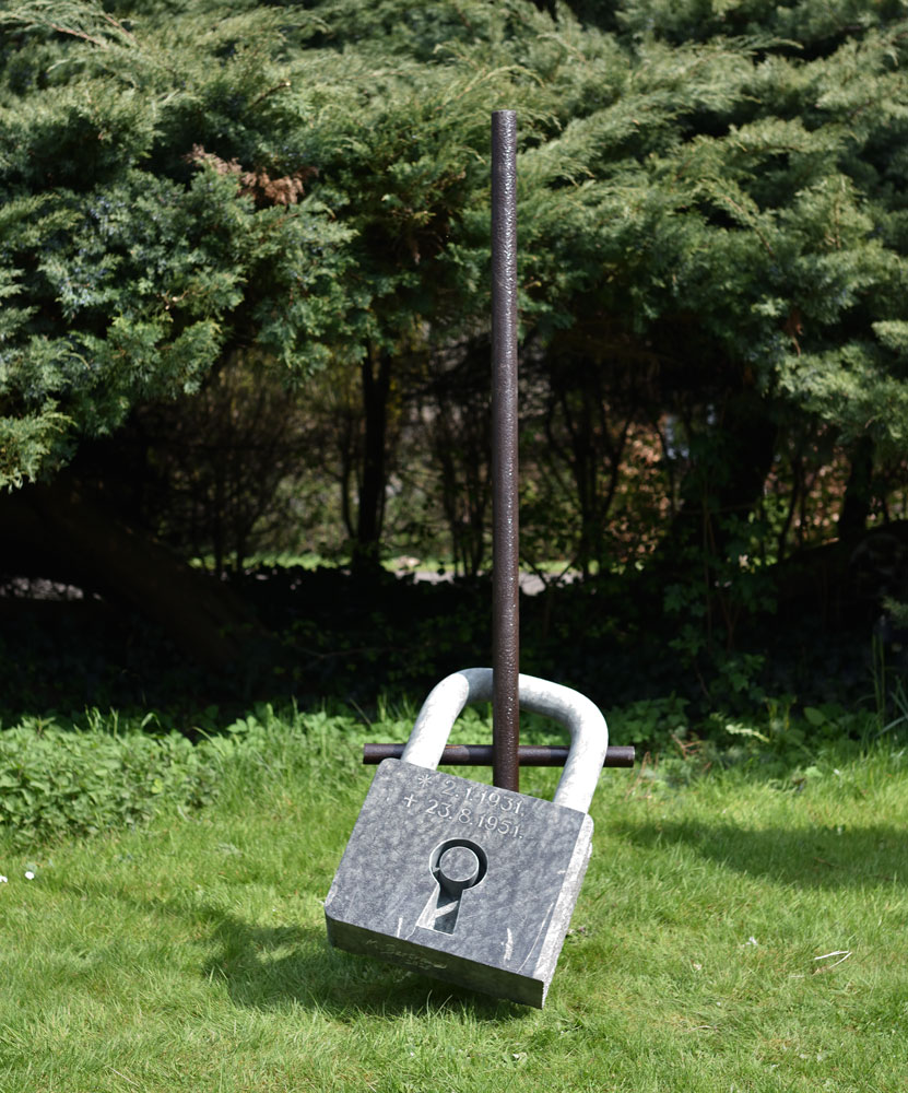 In der Skulptur „Schloss“ transformiert sich ein alltägliches Symbol kollektiver Romantik in ein Mahnmal der Vergänglichkeit. Ein überdimensioniertes Vorhängeschloss, dessen massiver Körper aus einem Diabas-Grabsteins geformt wurde, hängt schwer und unübersehbar an einem Stahlkreuz.